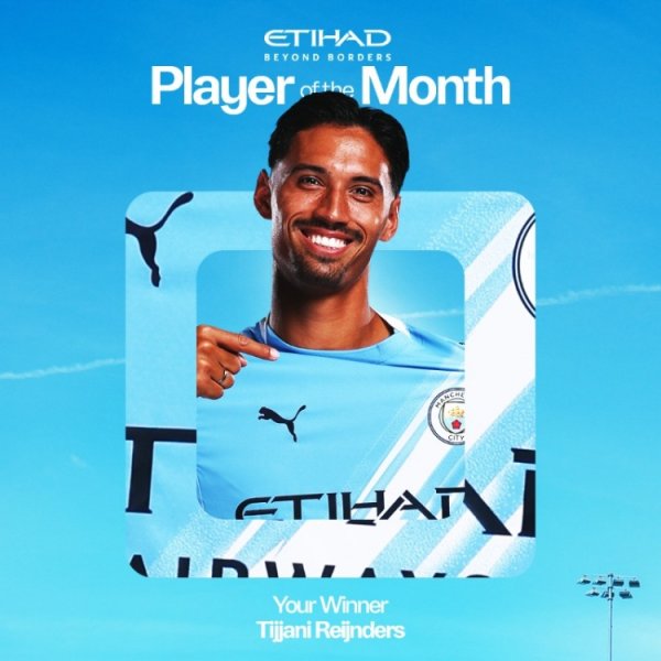 3轮1球1助功 !曼城官方:27岁新援中场球员赖因德斯当选8月最佳球员
