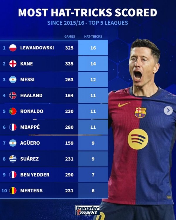 自15/16赛季五大职业联赛 独中三元次数榜:莱万16次居首,梅罗在列